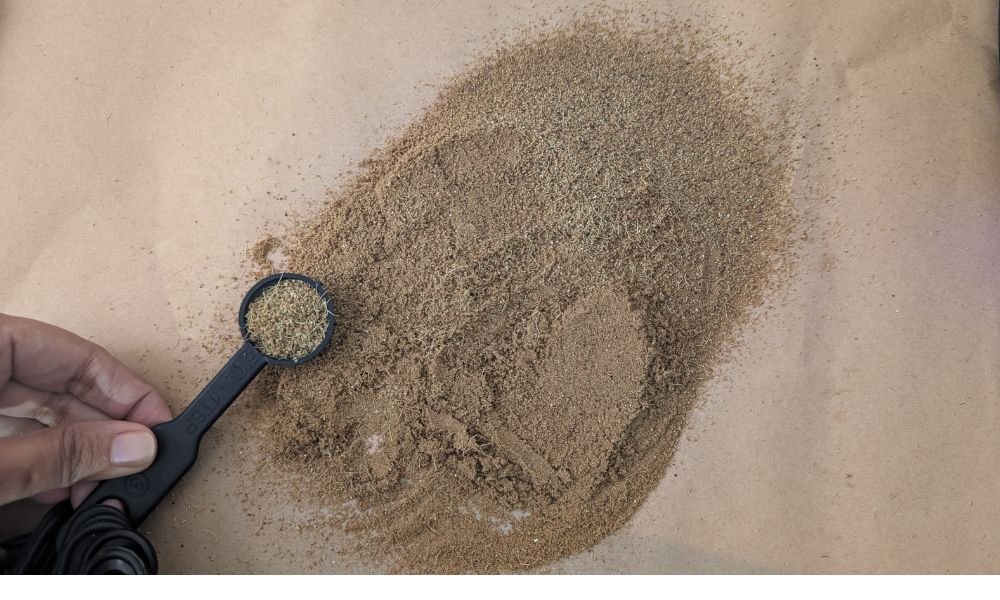 For dry grinding, we grind turmeric and garam masala into powder and sieve them to check how much coarse residue is left over. This helps us understand the strength and the ability of the mixer grinder to powder assorted ingredients.